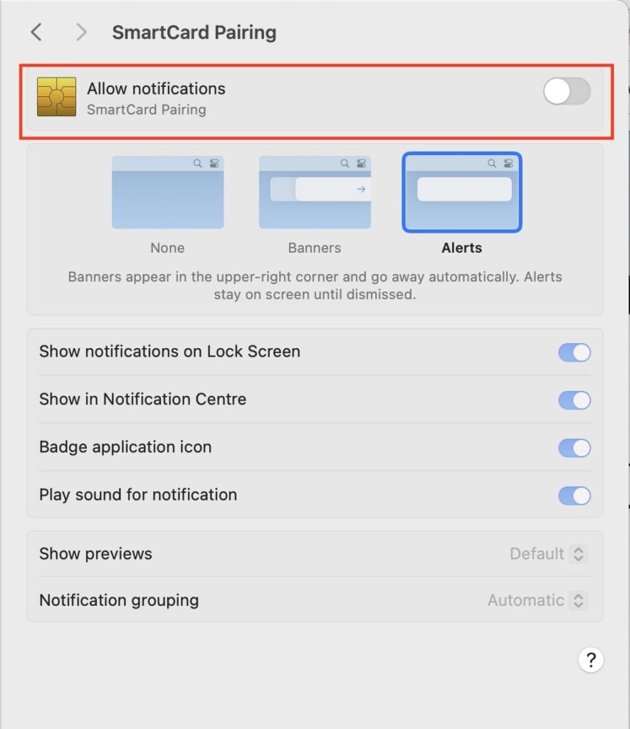 Image shows the configuration of notifications for the SmartCard pairing in MacOS.