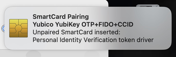 Image shows the notification you get when you plug in a SmartCard for login to MacOS.